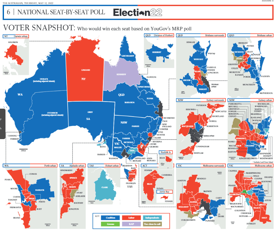 I have managed large-scale research projects for national political campaigns and other clients, including media outlets. An example of this done for the The Australian newspaper at the 2022 Australian federal election is shown above.
